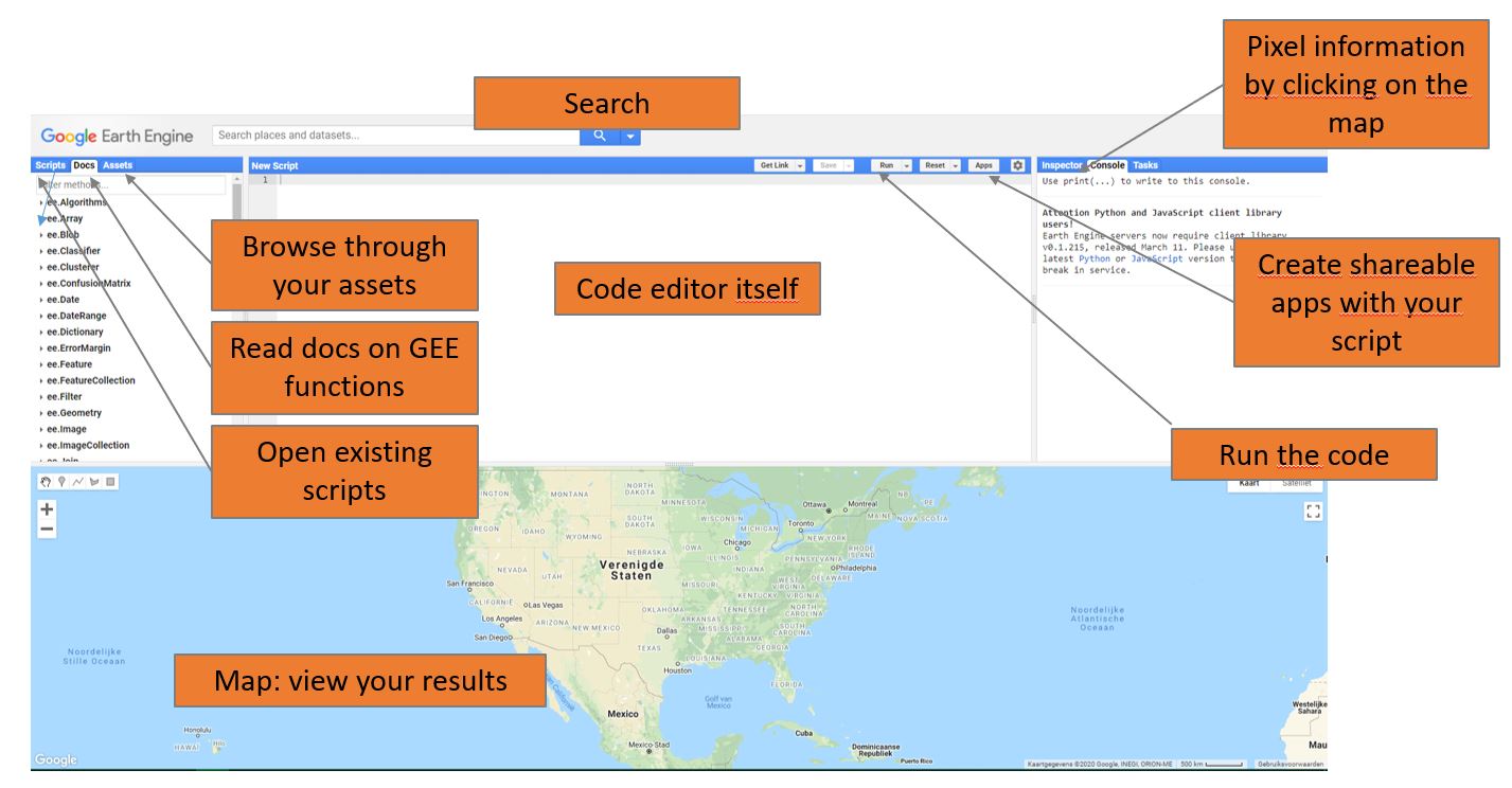 Google Earth Engine (GEE) kan op verschillende manieren worden gebruikt: via de eigen Code Editor, of als API in JavaScript en Python.